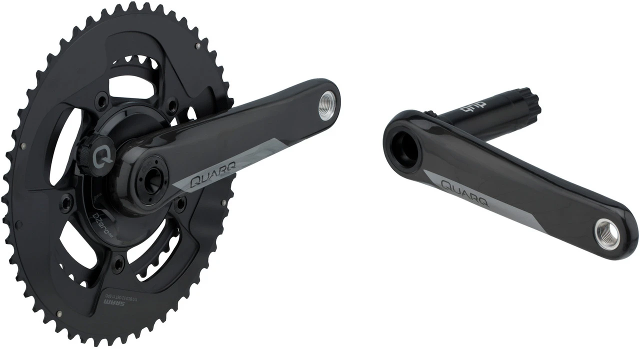 Die QUARQ DZero DUB Powermeter Compact Kurbelgarnitur ist eine Carbon-Kurbel mit DUB-Achse, an der ein 110 mm DZero Powermeter-Spider für präzise beidseitige Leistungsmessung verbaut ist. Kettenblätter mit 36 und 52 Zähnen werden mitgeliefert.