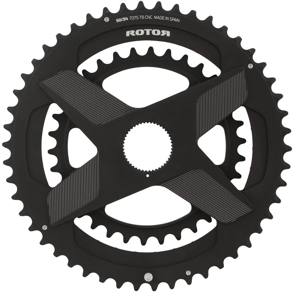 Bei diesem Bundle mitgeliefert wird ein rundes Rotor Spidering Doppelkettenblatt (noQ). Es ist aus einem Stück gefertigt und kann im Direct Mount Verfahren ohne Werkzeug auf der Achse montiert werden. Zum Wechsel wird lediglich ein 10er Innensechskantschlüssel benötigt, um den Kurbelarm der Antriebsseite zu montieren/demontieren. Das Knacken aufgrund der Schraubverbindungen zwischen Spider und Kettenblatt gehört damit der Vergangenheit an.