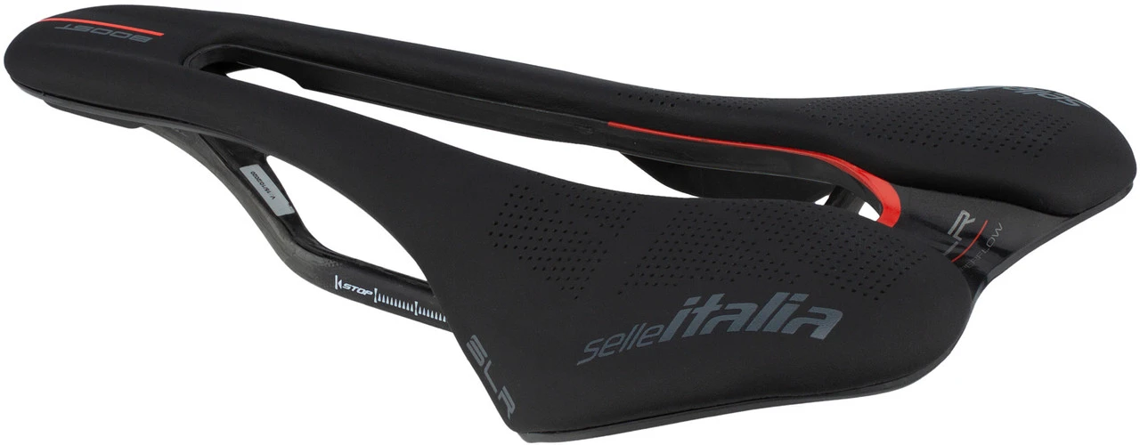 Der SLR Boost Kit Rennrad-Sattel von Selle Italia verfĂĽgt ĂĽber eine kompakte Form und Carbonstreben. Die Superflow-Aussparung in der Mitte sorgt fĂĽr Druckentlastung im Dammbereich.