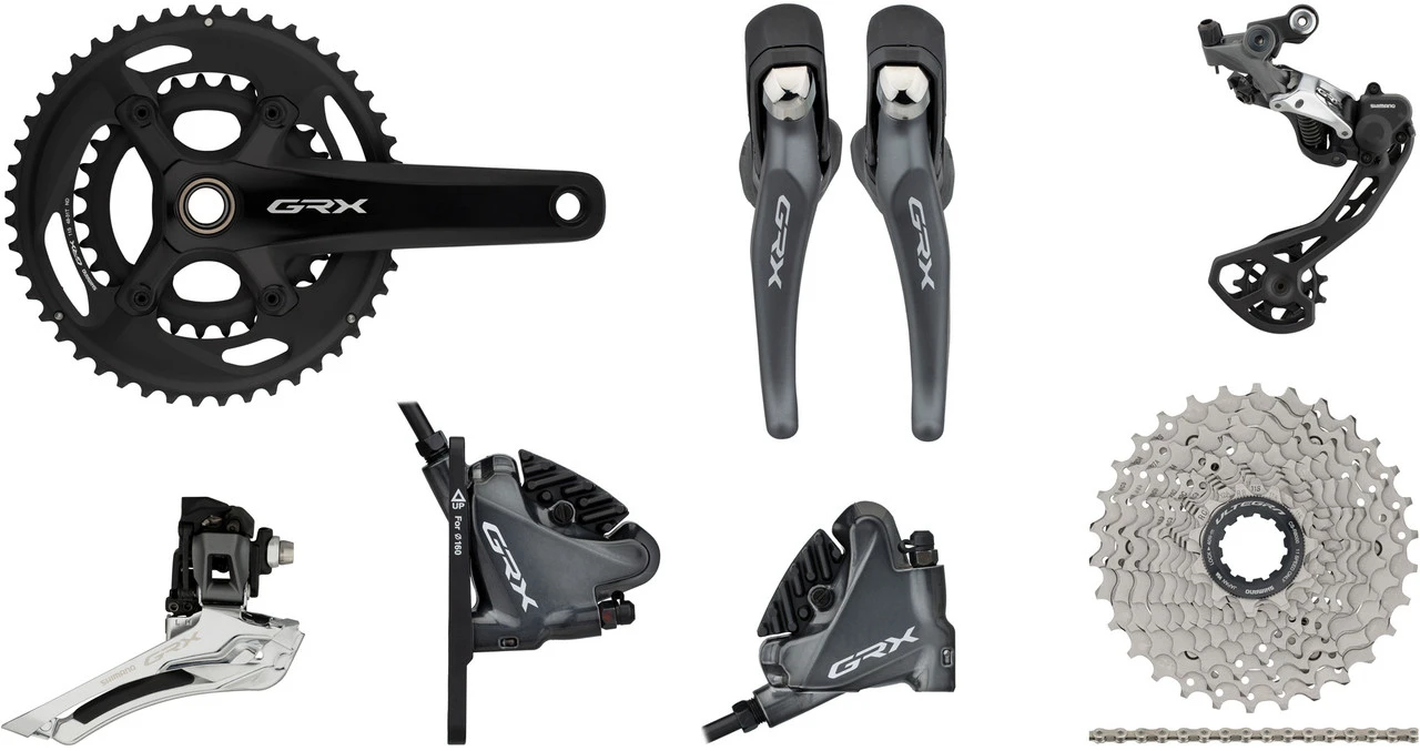 1 x Kurbelgarnitur Shimano GRX (FC-RX810-2)1 x Schaltwerk Shimano GRX Shadow Plus (RD-RX810)1 x Umwerfer Shimano GRX (FD-RX810)1 x Kassette Shimano Ultegra (CS-R8000) oder CS-HG800-11 (11-34)1 x Kette Shimano Ultegra / XT Quick-Link (CN-HG701-11)2 x Scheibenbremse Shimano GRX BR-RX810 + GRX ST-RX810, VR und HR1 x Bremsleitung Shimano SM-BH90-JK-SSR 1000 mm (VR)1 x Bremsleitung Shimano SM-BH90-JK-SSR 1700 mm (HR)2 Paar Bremsbeläge Shimano1 x Scheibenbremsadapter für VR2 x Leitungsanschlussset mit Oliven und Insertpins2 x Befestigungsschraube Typ A (VR)2 x Befestigungsschraube für 25 mm Rahmendurchmesser (HR)1 x Kassetten-Spacer Shimano 1,85 mm (nur bei 11-34)1 x Schaltzug 1800 mm (VR) und 2200 mm (HR)1 x Außenhülle 600 mm (VR) und 600 + 300 mm (HR)Bremsenset montagefertig, befüllt, nach der Montage ist eine Entlüftung zu empfehlen