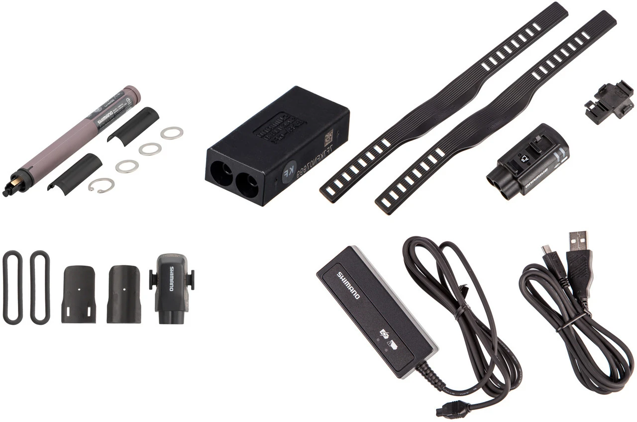 1 x Kassette Shimano XTR CS-M90011 x Schaltwerk Shimano XTR Di2 Shadow Plus (RD-M9050)1 x Kette Shimano XTR / Dura-Ace CN-HG901-111 x Schalter Shimano XTR Di2 (SW-M9050), rechts1 x Akku Shimano Di2 (BT-DN110)1 x Ladegerät Shimano Di2 (SM-BCR2)1 x Verteilerdose Shimano SM-JC41 intern1 x Elektrischer Verteiler Shimano 3 Port (SM-EW90-A, nur bei Version ohne Display)1 x Drahtlos-Einheit Shimano (EW-WU101, nur bei Version ohne Display)1 x Systeminformations-Display Shimano Di2 SC-M9051 (nur bei Version mit Display)1 x Kassetten-Abschlussring Shimano Aluminium1 x Kettenschloss Shimano SM-CN900-11 Quick-Link1 x Steckerwerkzeug Shimano TL-EW021 x Ladekabel Shimano USB Y-7FJ000201 x Befestigungsmaterial für EW-WU101 (nur bei Version ohne Display)2 x Lenkerschellen-Adapter (nur bei Version mit Display)