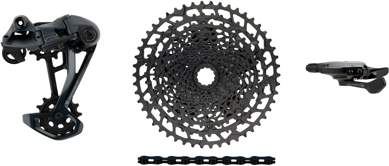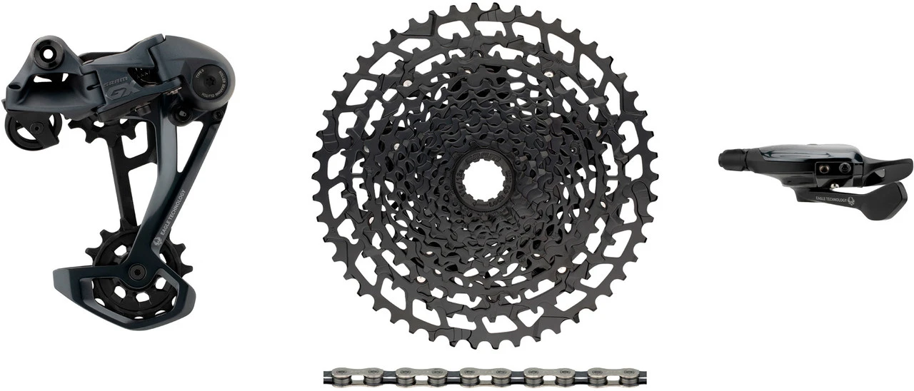 Schaltwerk:lunar (dunkelgrau)Schaltgriff:lunar (dunkelgrau)Kassette:blackKette:nach Wahl XX1 rainbow (bunt), XX1 copper (kupferrot), XX1 gold, XX1 black, GX silver-blackHerstellernummern:Schaltwerk: 00.7518.137.000Schaltgriff: 00.7018.432.000Kassette: 00.2418.086.000Kette: 00.2518.039.010 (XX1 rainbow), 00.2518.043.010 (XX1 copper), 00.2518.024.020 (XX1 gold), 00.2518.024.021 (XX1 black), 00.2518.030.011 (GX silver-black)Lieferumfang:1 x Schaltwerk SRAM GX Eagle1 x Schaltgriff SRAM Trigger GX Eagle Single Click 12-fach1 x Kassette SRAM NX Eagle PG-12301 x Kette SRAM PC XX1 Eagle oder PC GX Eagle (nur GX silver-black)1 x Kettenschloss SRAM PowerLock1 x Klemmschelle SRAM1 x Schaltzug SRAM 2200 mm1 x Einstelllehre SRAM Chain Gap Adjustment GaugeDirekt mitbestellen:Schaltzugaußenhülle