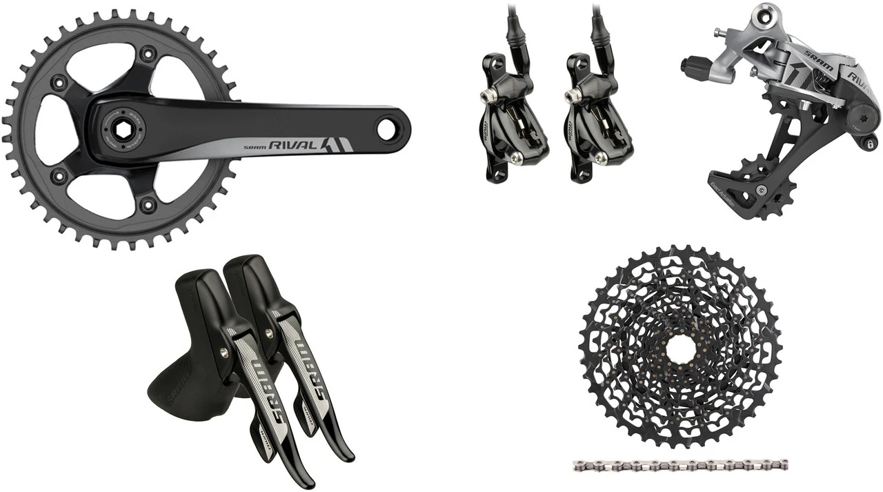 1 x Kurbelgarnitur SRAM Rival 1 BB301 x Kettenblatt SRAM 42 Zähne1 x Schaltwerk SRAM Rival 1 Type 3.0 lang1 x Bremsgriff SRAM Rival 1 1-fach1 x Schalt-/Bremsgriff SRAM Rival 22 DoubleTap® 11-fach1 x Scheibenbremse SRAM Rival 1 (Postmount) VR links, montagefertig befĂĽllt und entlĂĽftet1 x Scheibenbremse SRAM Rival 22 (Postmount) HR rechts, montagefertig befĂĽllt und entlĂĽftet1 x Kassette SRAM PG-1130 oder XG-1150 (nur bei 10-42 Z)1 x Kette SRAM PC 1130 (114 Glieder)Direkt mitbestellen:Optional erhältliches Zubehör: