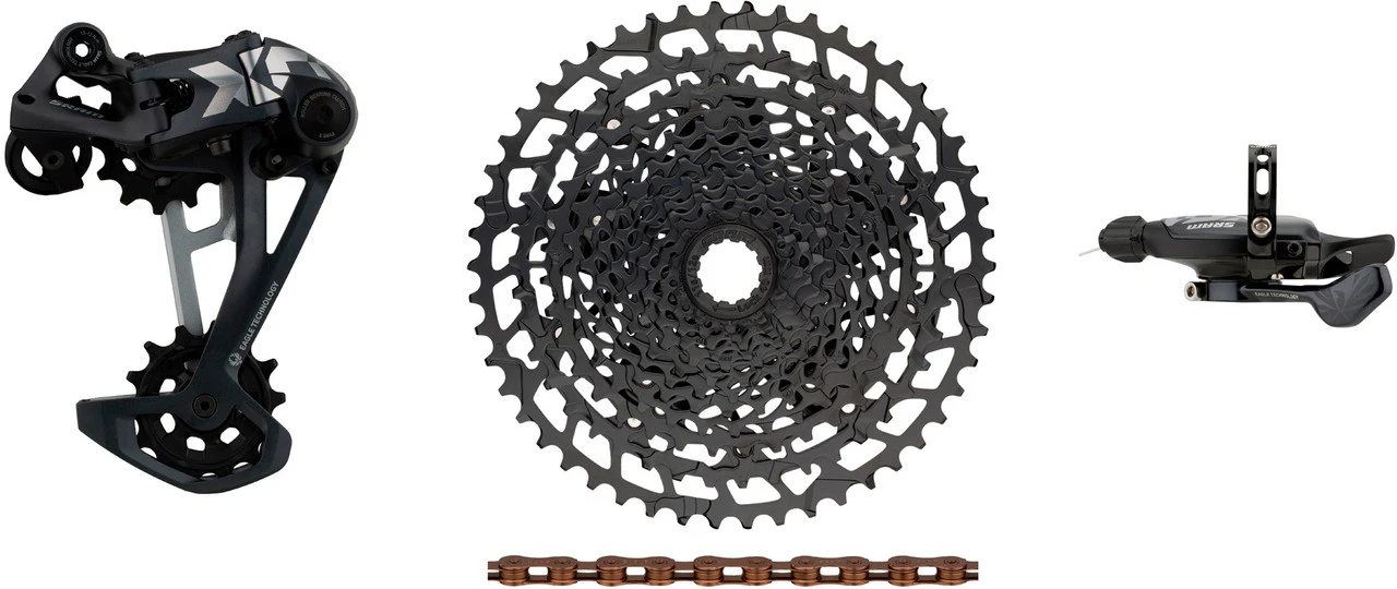 Schaltwerk:lunar (dunkelgrau)Schaltgriff:lunar (dunkelgrau)Kassette:blackKette:nach Wahl XX1 rainbow (bunt), XX1 copper (kupferrot), XX1 gold, XX1 black, X01 silverHerstellernummern:Schaltwerk: 00.7518.138.001Schaltgriff: 00.7018.434.001Kassette: 00.2418.086.000Kette: 00.2518.039.010 (XX1 rainbow), 00.2518.043.010 (XX1 copper), 00.2518.024.020 (XX1 gold), 00.2518.024.021 (XX1 black), 00.2518.023.011 (X01 silver)Lieferumfang:1 x Schaltwerk SRAM X01 Eagle1 x Schaltgriff SRAM Trigger X01 Eagle Single Click 12-fach1 x Kassette SRAM NX Eagle PG-12301 x Kette SRAM PC XX1 Eagle oder PC X01 Eagle (nur X01 silver)1 x Kettenschloss SRAM PowerLock1 x Klemmschelle SRAM1 x Schaltzug SRAM 2200 mm1 x Einstelllehre SRAM Chain Gap Adjustment GaugeDirekt mitbestellen:Schaltzugaußenhülle